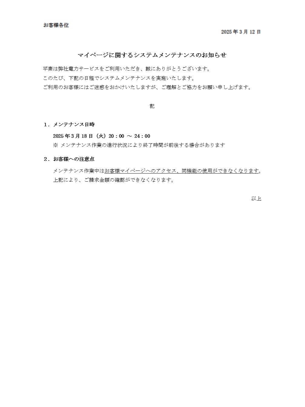 速トクでんきHP通知_20250312_マイページに関するシステムメンテナンスのお知らせ